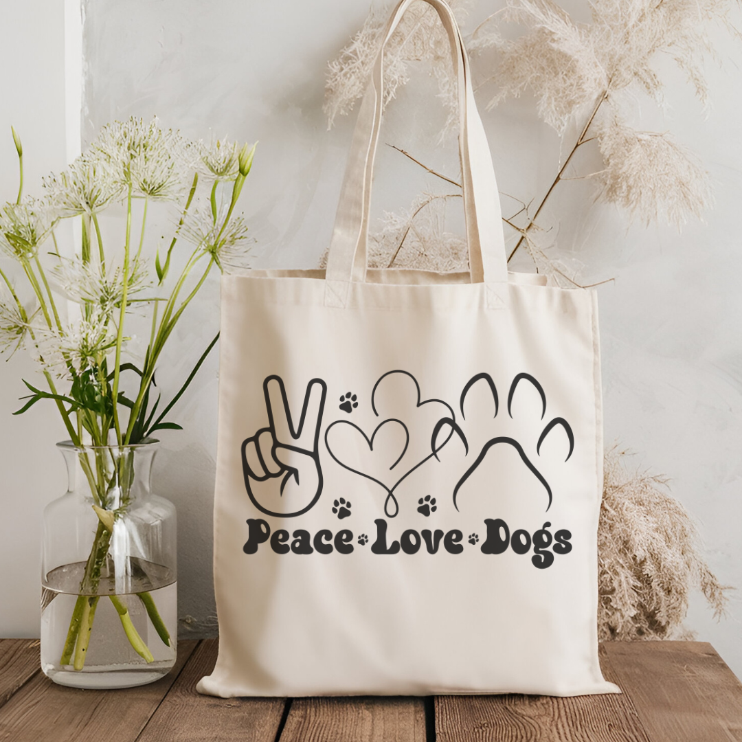 For the dog lover who carries their heart (and their essentials) with them, this Peace Love Dogs tote bag is the perfect companion! Made from durable cotton canvas, it's as stylish as it is practical – whether you're headed to the park, the grocery store, or just out for a stroll with your pup!