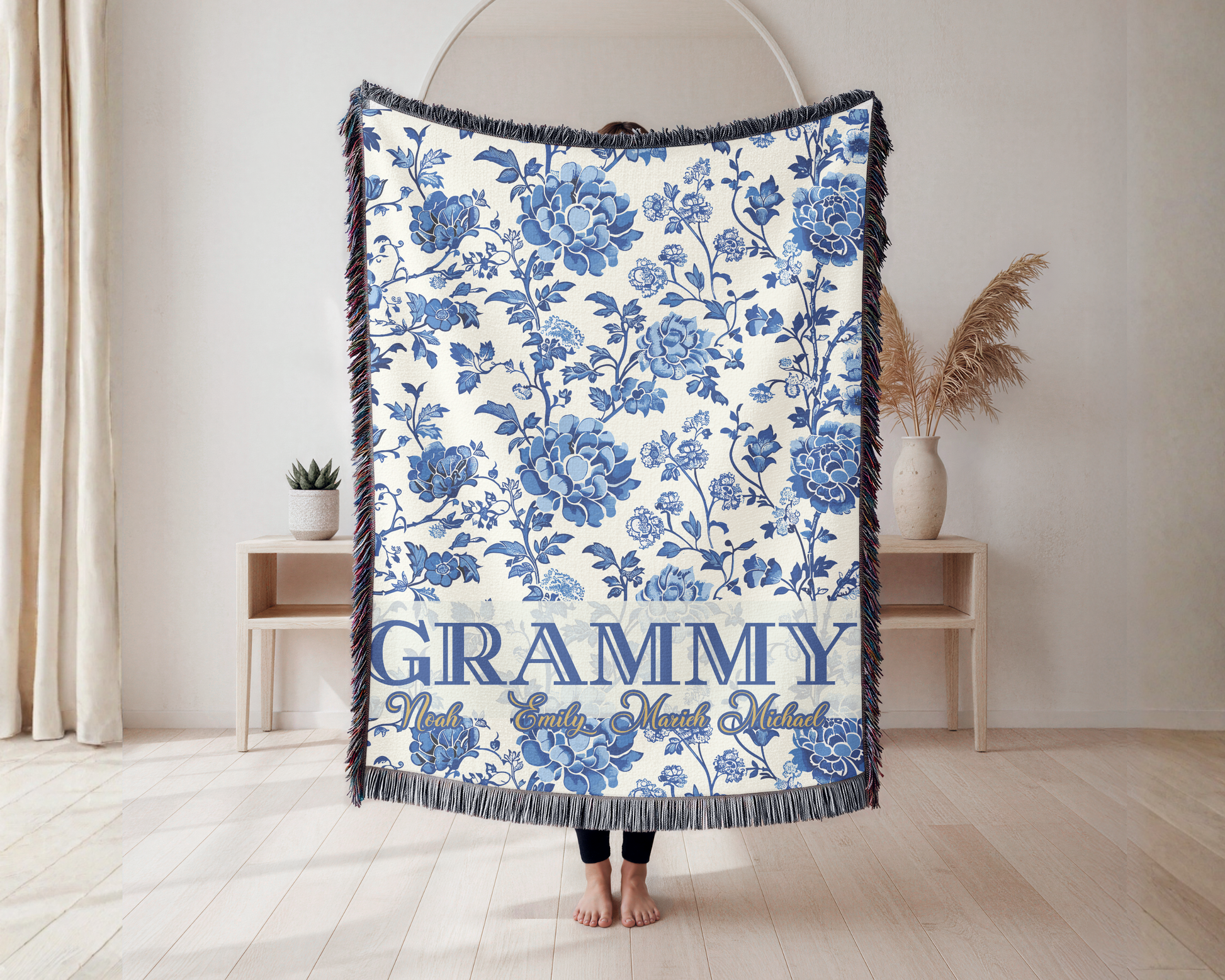 Personalized Grandma Blanket – Custom Woven Blanket with Grandkids Names, Floral Throw Blanket, Gift for Grammy, Mother’s Day Gift, Christmas Gift for Grandma