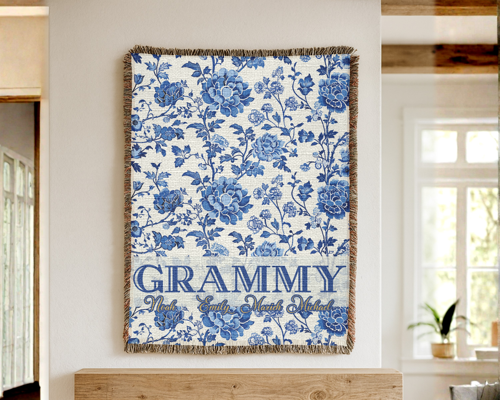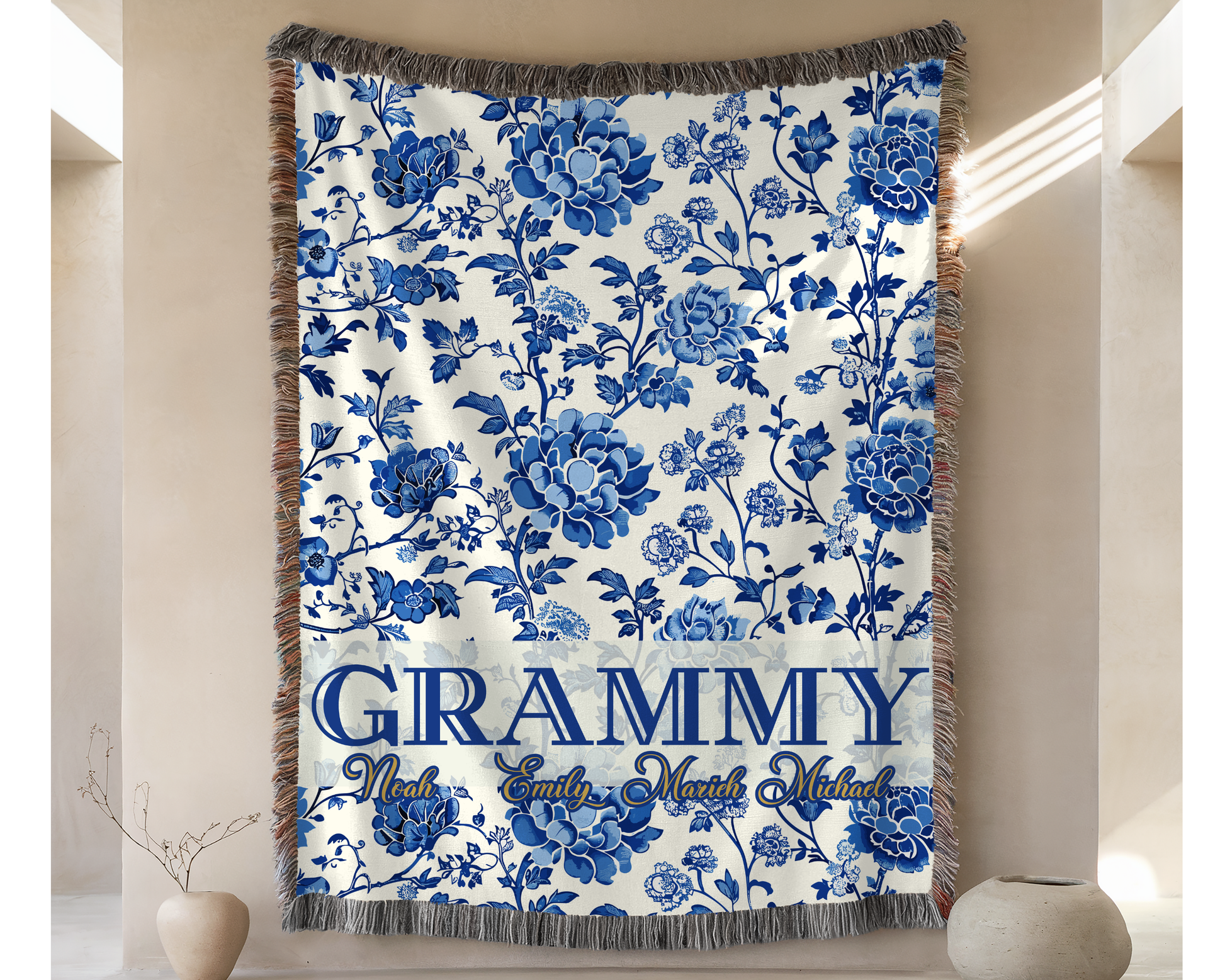 Wrap your grandma in love with our Personalized Grandma Blanket – a cozy woven throw featuring a stunning floral pattern and the names of her beloved grandchildren.